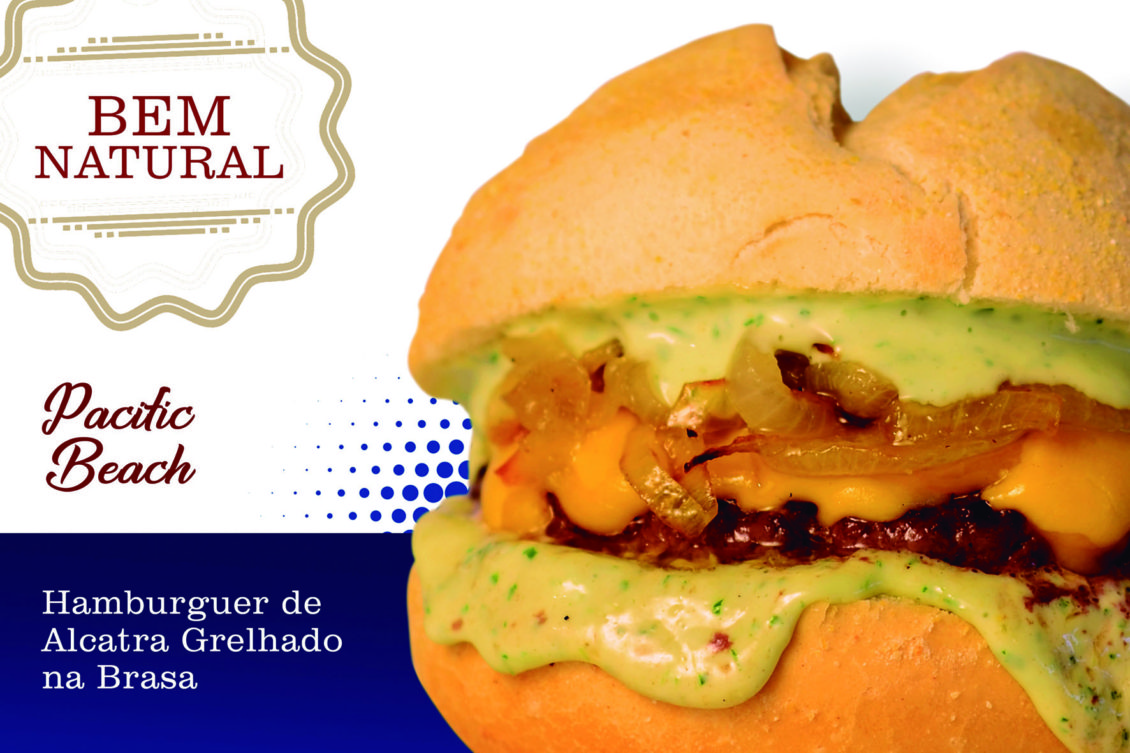 PACIFIC BEACH: Hambúrguer de alcatra e peito grelhado na brasa, queijo prato, cebola