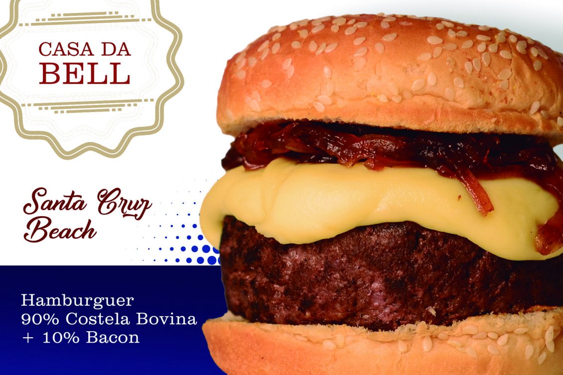 SANTA CRUZ BEACH: Blend de 90% costela e 10% bacon, fondue de queijo, cebola roxa