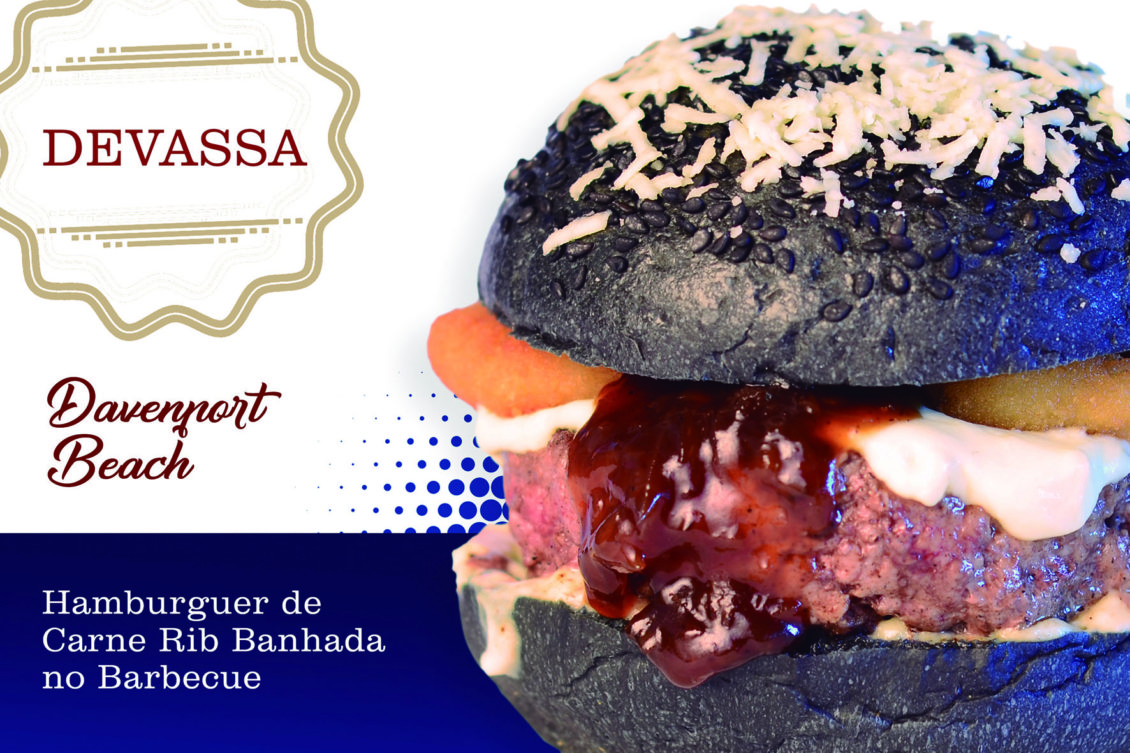 DAVENPORT BEACH: Hambúrguer de carne rib banhada no barbecue, blend de queijos,