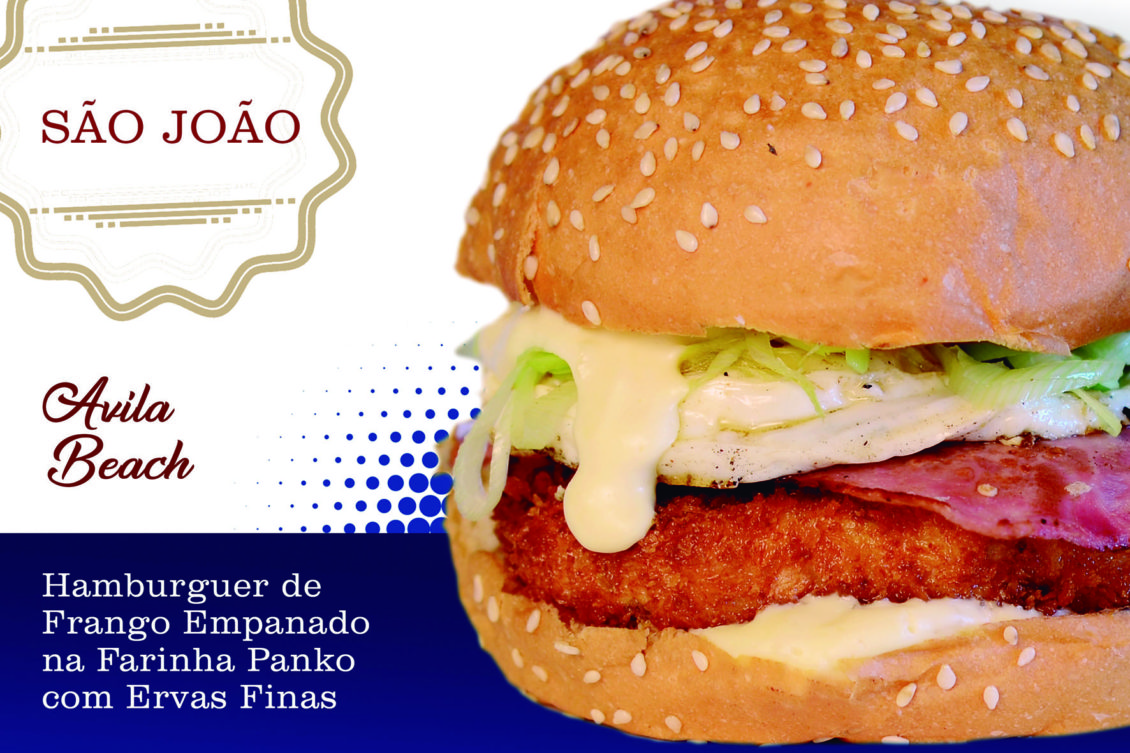 AVILA BEACH: Hambúrguer de frango empanado na farinha panko com ervas finas, creme de