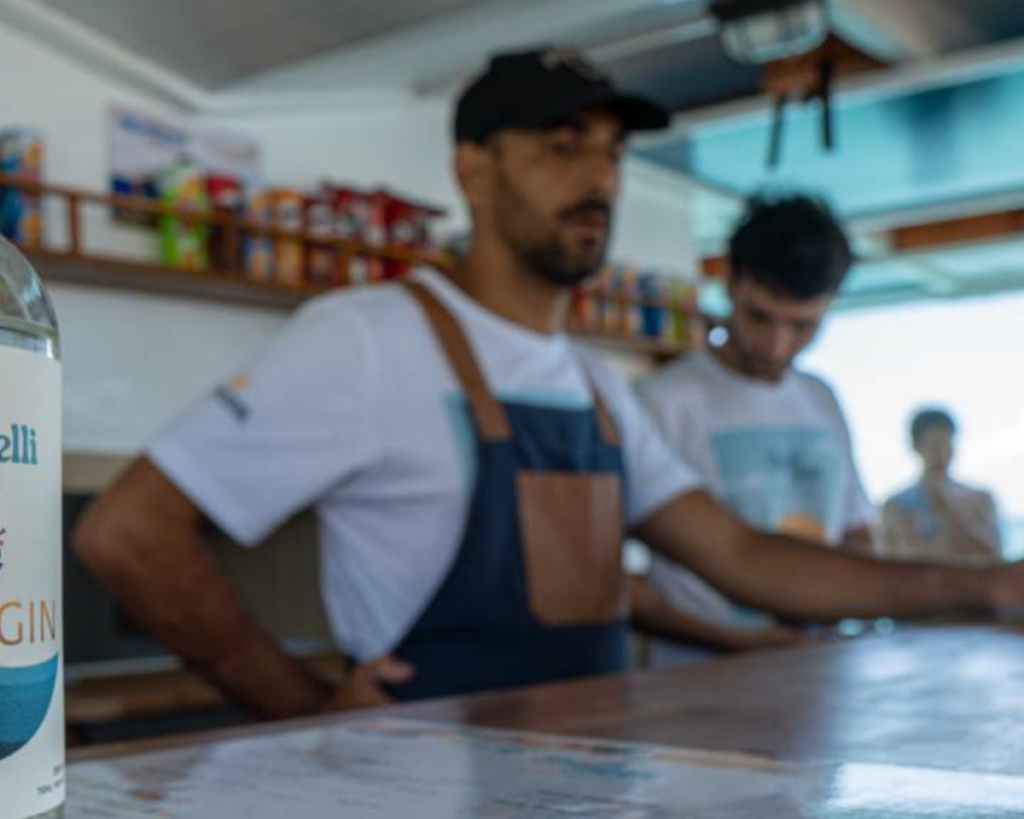 A bordo, o serviço segue um padrão claramente profissionalizado. A equipe atua uniformizada, com treinamento específico e atendimento em três idiomas, refletindo o perfil cosmopolita da cidade. O bar e a cozinha são comandados pelo Belli Belli Gastrobar, grupo consolidado em Búzios, com três casas em funcionamento e reconhecimento consistente de público e crítica. O Belli Belli também mantém um beat club no balneário e recebeu o prêmio Melhores da Taça, da revista Prazeres da Mesa, pelo destaque de sua carta de bebidas — um selo que ajuda a compreender o cuidado aplicado à experiência gastronômica, mesmo em ambiente marítimo.
