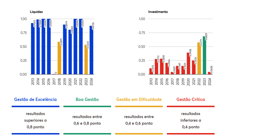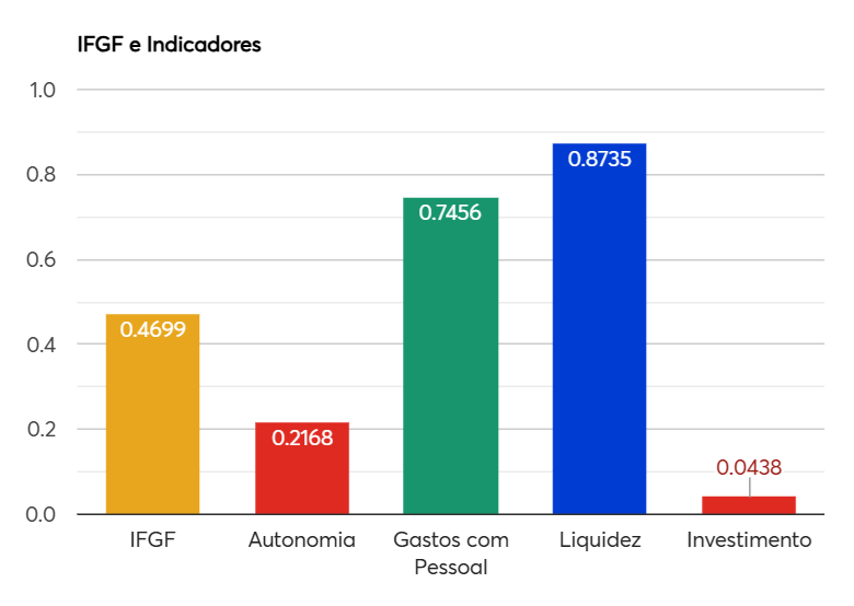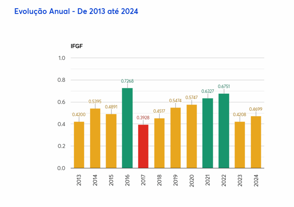 O histórico do IFGF mostra uma cidade que, apesar de manter liquidez, falha na alocação eficiente de recursos. O pico de investimentos ocorreu em 2022 (0,6829), mas caiu drasticamente em 2024, indicando instabilidade e mudanças de prioridades administrativas.