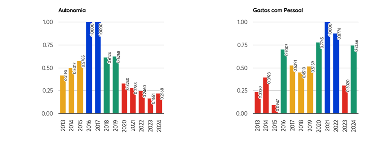 - Gastos com pessoal: 0,7456 em 2024, mostrando disciplina relativa no controle da folha, porém com grandes flutuações ao longo da década, incluindo quedas severas em 2015 (0,0947) e 2023 (0,3020).