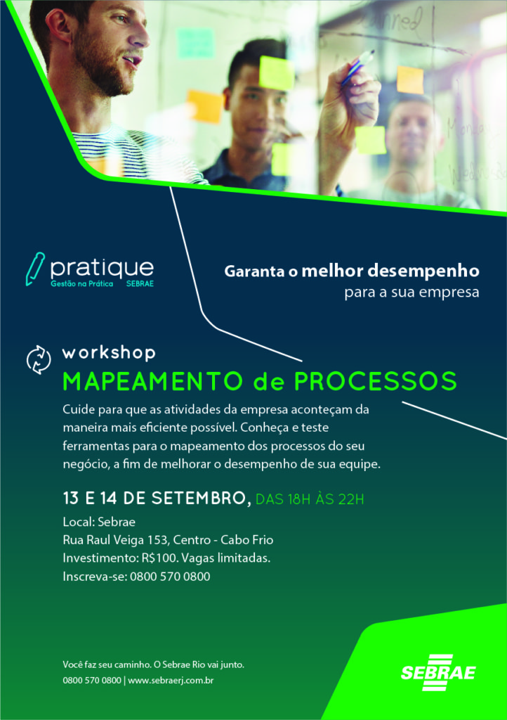 Para que as atividades de uma empresa aconteçam da forma mais eficiente possível e as decisões sejam tomadas de modo ágil, é importante que todos os processos internos sejam mapeados e os controles financeiros funcionem em tempo real. Para auxiliar os empresários da Região dos Lagos, o Sebrae/RJ oferece neste mês de setembro, em Cabo Frio, dois Workshops Pratique: Mapeamento de Processos, nos dias 13 e 14, e Controles Financeiros, nos dias 20 e 21. As vagas são limitadas e as inscrições já estão abertas.