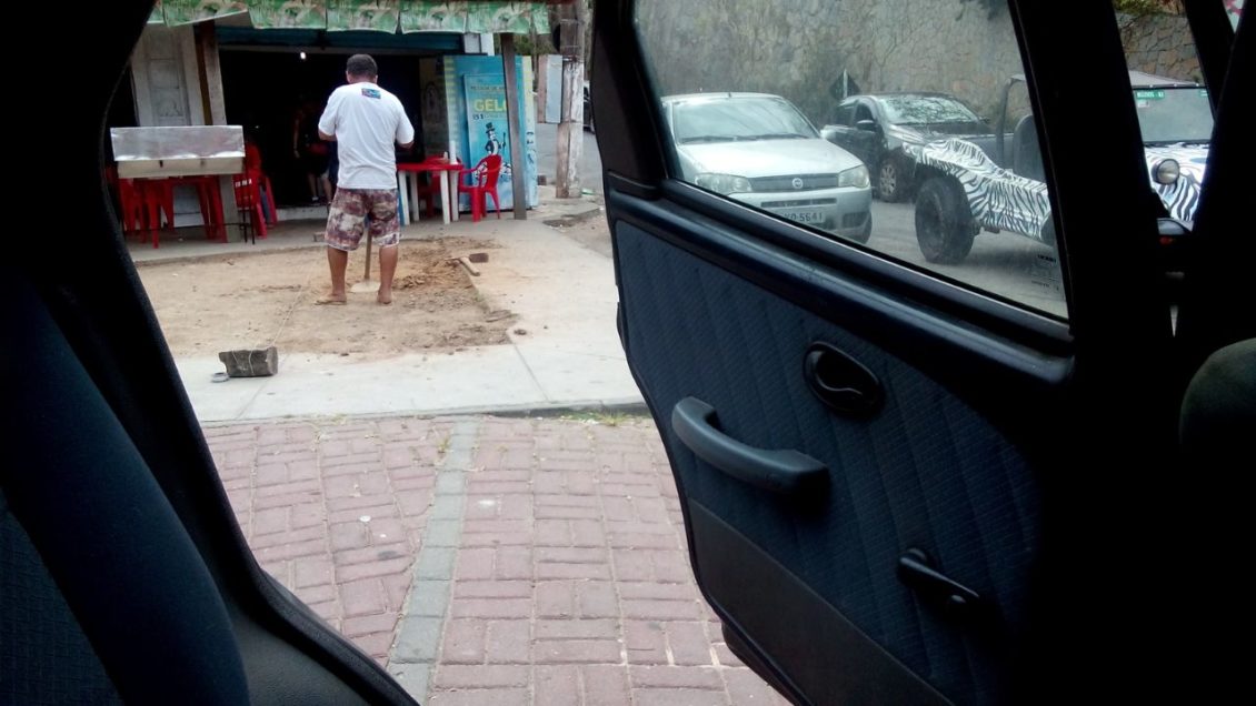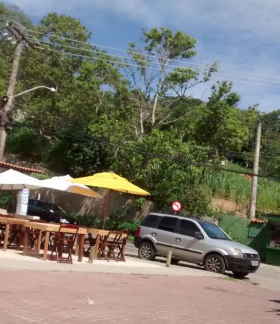 Denúncia recebida pelo Prensa mostra em fotos a esquina da Rua dos Artesões com a Estrada da Usina, bairro Brava, em Búzios, um bar ocupando um espaço onde antes havia um canteiro público. Cadeiras e mesas estão no local.