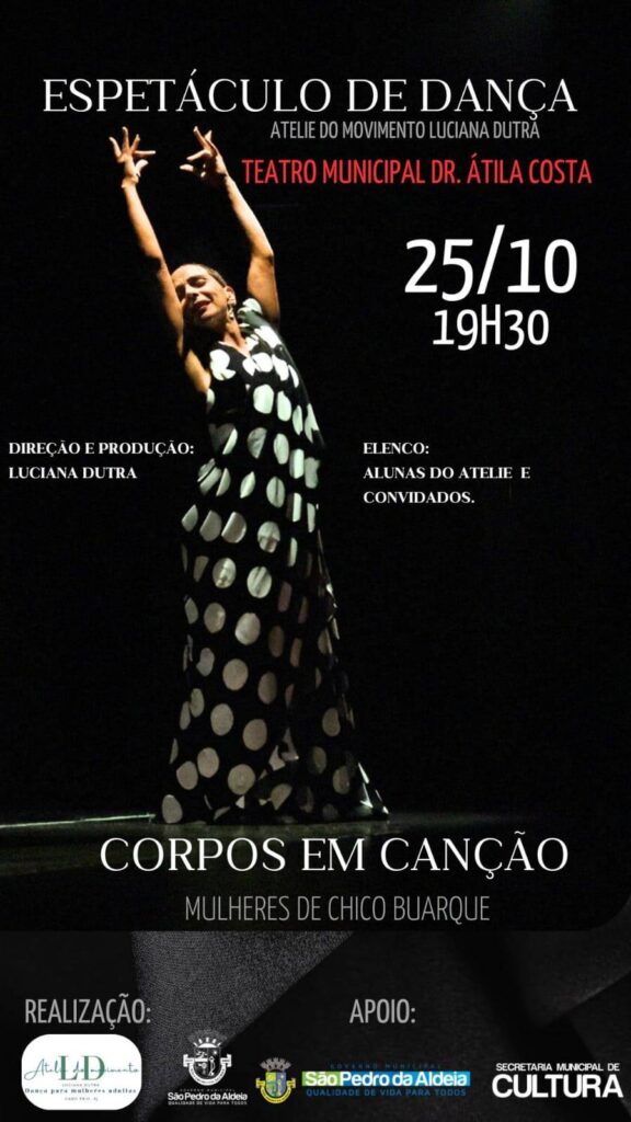 Um espetáculo de dança que transforma o corpo feminino em expressão artística estreia no próximo sábado (25), às 19h30, em São Pedro da Aldeia. “Corpos em Canção – Mulheres de Chico Buarque” será apresentado no Teatro Municipal Doutor Átila Costa, com ingressos a R$ 25 (meia) e R$ 50 (inteira).