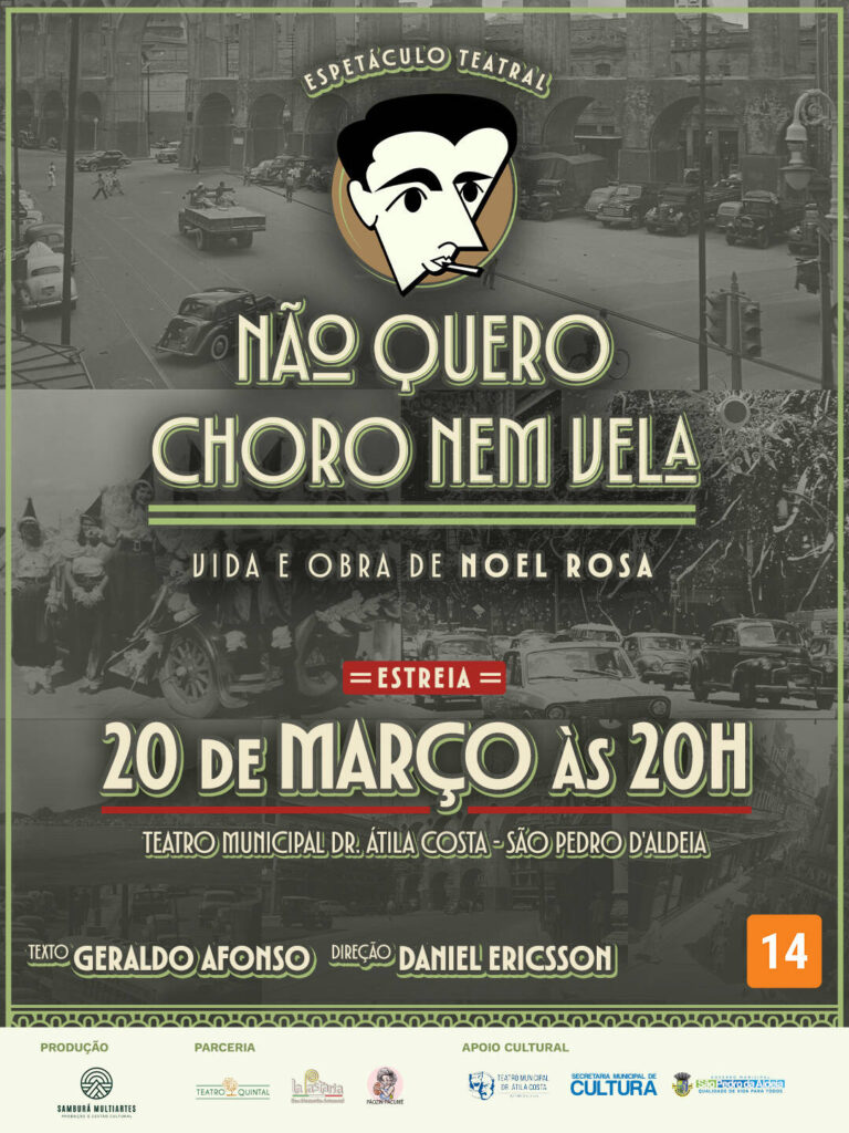 O espetáculo “Não Quero Choro Nem Vela: Vida e Obra de Noel Rosa” estreia no dia 20 de março de 2026, às 20h, no Teatro Municipal Dr. Átila Costa, em São Pedro da Aldeia (RJ). A montagem teatral musicada propõe revisitar a trajetória de um dos principais nomes da música popular brasileira.