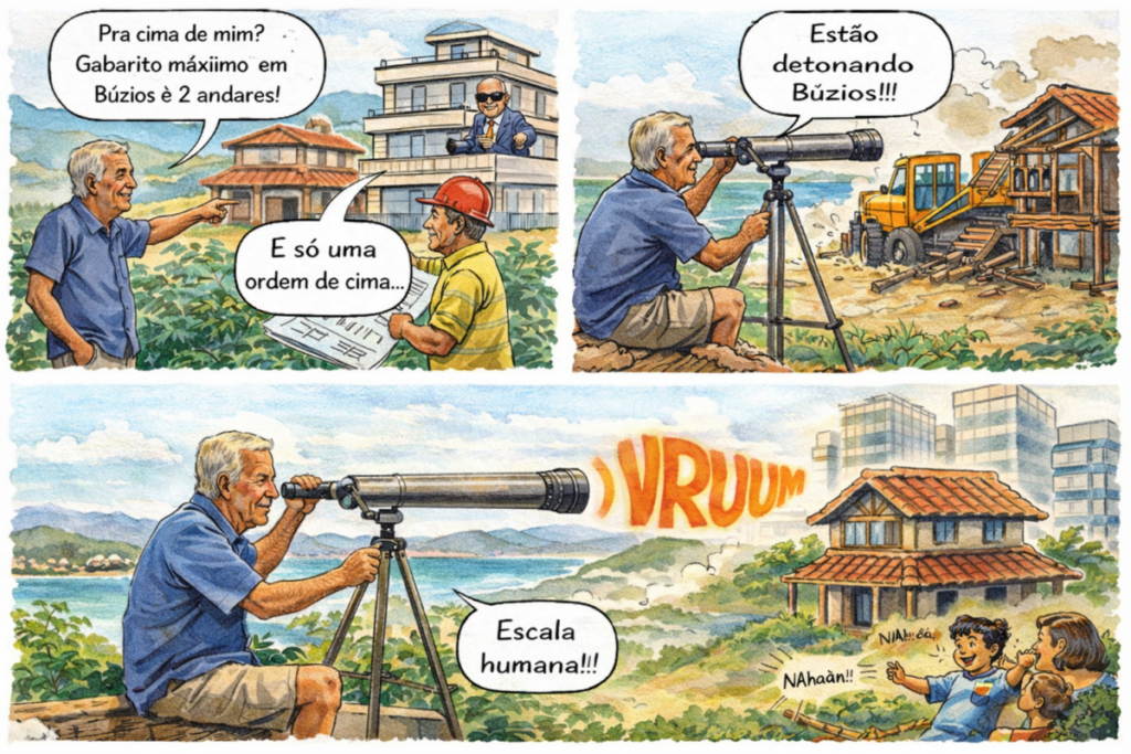 Ainda na década de 1990, uma das maiores incorporadoras do Rio de Janeiro chegou á cidade com a proposta de construir um condomínio com casas geminadas de quatro andares no centro de Búzios. Na época a lei de gabarito máximo de dois pavimentos já estava aprovada, mas isso não impediu que de tentarem contornar a norma com um projeto camuflado, que, segundo o próprio material de divulgação, poderia futuramente ser “adaptado” para alcançar os quatro andares originalmente desejados. “Combinei com minha mãe, que se fez de interessada, foi até lá, pegou o panfleto, planta baixa, e ouviu tudo do próprio corretor. Era isso mesmo: iam fazer dois agora, mas já afirmavam eu depois, pela escala acima da norma, daria para levantar mais andares. Pronto. Foi o que precisava”, conta com um sorriso maroto e uma piscadela que convida a ler nas entrelinhas do que será narrado.