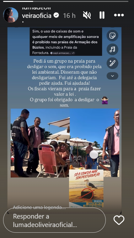 A atriz Luma de Oliveira acionou nesta semana agentes de postura da prefeitura de Armação dos Búzios após ser incomodada por som alto na praia. A fiscalização foi chamada para garantir o cumprimento do Decreto nº 1.321, de 26 de dezembro de 2019, que estabelece regras para o uso da faixa de areia no município.