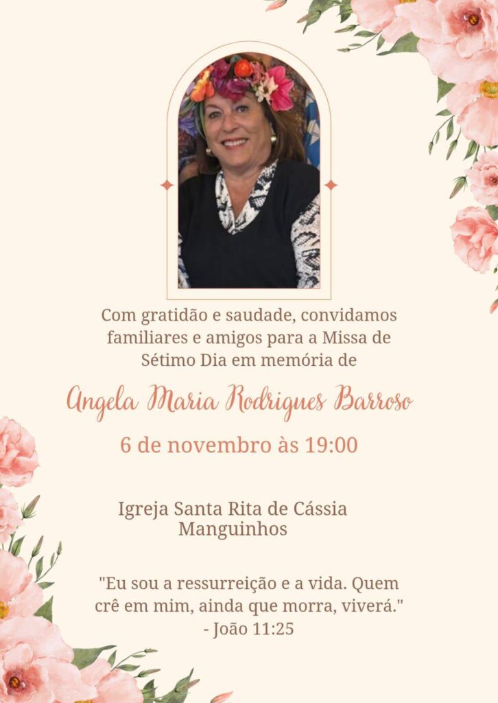 A missa de7º Dia de Ângela Barroso será celebrada nesta quinta-feira (6), às 19h, na Igreja Santa Rita de Cássia, em Manguinhos, em Búzios. Familiares e amigos convidam a comunidade para prestar homenagens e celebrar a memória da buziana, reconhecida pela atuação social no município.