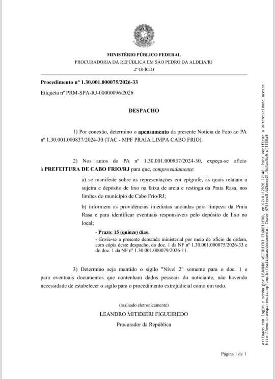 A Prensa solicitou posicionamento oficial da Prefeitura de Cabo Frio sobre as denúncias, questionando a existência de cronograma regular de limpeza para a Praia Rasa, as providências adotadas e o teor da eventual notificação do MPF. Até o fechamento desta edição, não houve retorno. O espaço permanece aberto para manifestação do município.