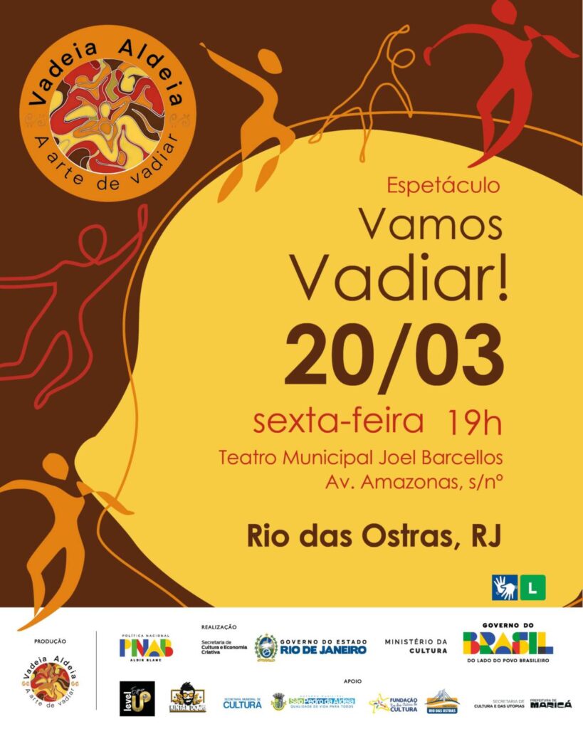 A programação começa na sexta-feira (20), às 19h, com o musical “Vamos Vadiar”, que propõe uma reflexão sobre a cultura popular brasileira a partir de ritmos como capoeira, jongo e maracatu. A montagem, do Coletivo Vadeia Aldeia, utiliza elementos como tambores, berimbaus e violão para abordar saberes e territórios historicamente marginalizados.