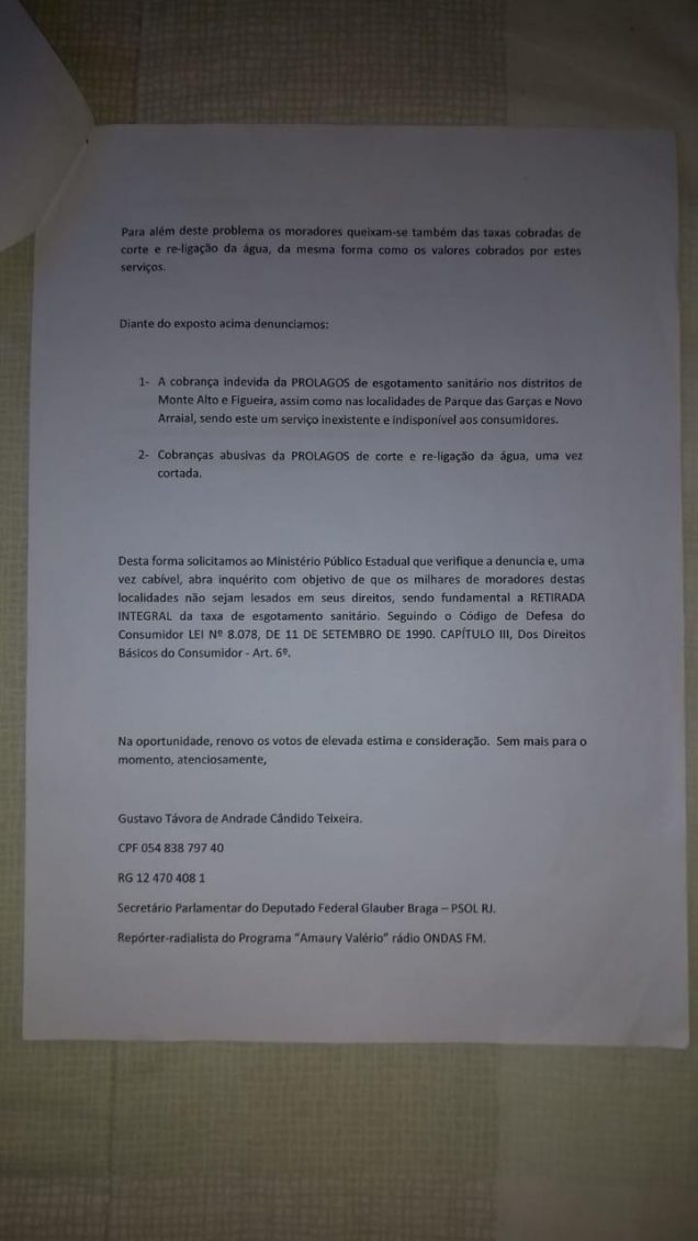 “O contrato da Prolagos que vai até 2041 precisa ser revisto, de forma urgente. O péssimo atendimento no abastecimento de água, e essa questão grave na rede de água ser a mesma do esgoto é uma tragédia ao Meio Ambiente. Em Cabo Frio apenas 15% do esgoto está em rede separada. Estivemos recentemente na Praia do Siqueira, e esse esgoto está adoecendo os pescadores locais da Laguna de Araruama. Isso é grave! E a concessionária precisa ter responsabilidade sobre isso.”, Lucas Miller, presidente do PSOL Cabo Frio.