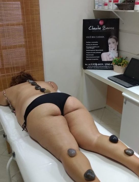 Depois desse momento de cuidados com a drenagem passamos para a massagem com pedras quentes, conforme a Larissa Martins contou no vídeo, essa massagem relaxante é feita com hágatas aquecidas, cristais com propriedades minerais que promovem relaxamento e uma sensação calmante.
