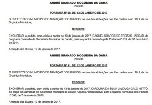 “O prefeito do município de Armação dos Búzios, no uso das atribuições que lhe confere o art. 79, I, da Lei Orgânica Municipal, resolve: exonerar a pedido, com efeito a contar de 13 de janeiro de 2017, Raquel Soares de Freitas Haddad, do cargo em comissão de Secretária Municipal de Saúde, para o qual foi nomeada pela Portaria nº 519, de 30 de outubro de 2014. Armação dos Búzios, 12 de janeiro de 2017” trecho do Boletim Oficial desta sexta-feira.