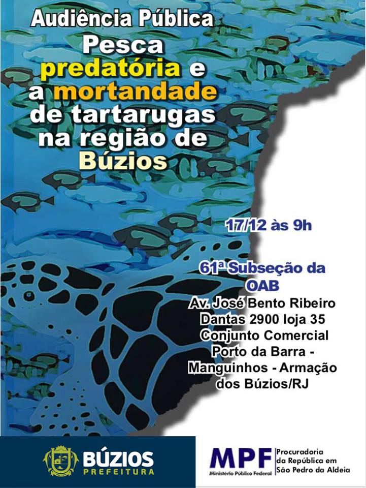 Já no dia 17, na parte da manhã, das 9h às 12h, a Prefeitura de Búzios e o Ministério Público Federal organizam a Audiência Pública sobre pesca predatória e a mortandade de tartarugas em Búzios, na 61º subseção da OAB, no Porto da Barra, em Manguinhos.