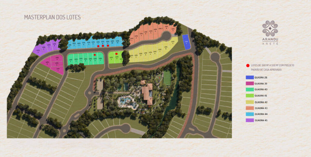 Quem adquirir um lote no Arandu poderá usufruir das quatro sedes exclusivas do Clube Aretê, com estrutura completa de lazer, esportes e gastronomia, pensadas para garantir bem-estar o ano todo. O comprador também pode optar por receber a casa pronta, escolhendo entre quatro projetos arquitetônicos previamente aprovados, mantendo a identidade estética e a harmonia visual do bairro.