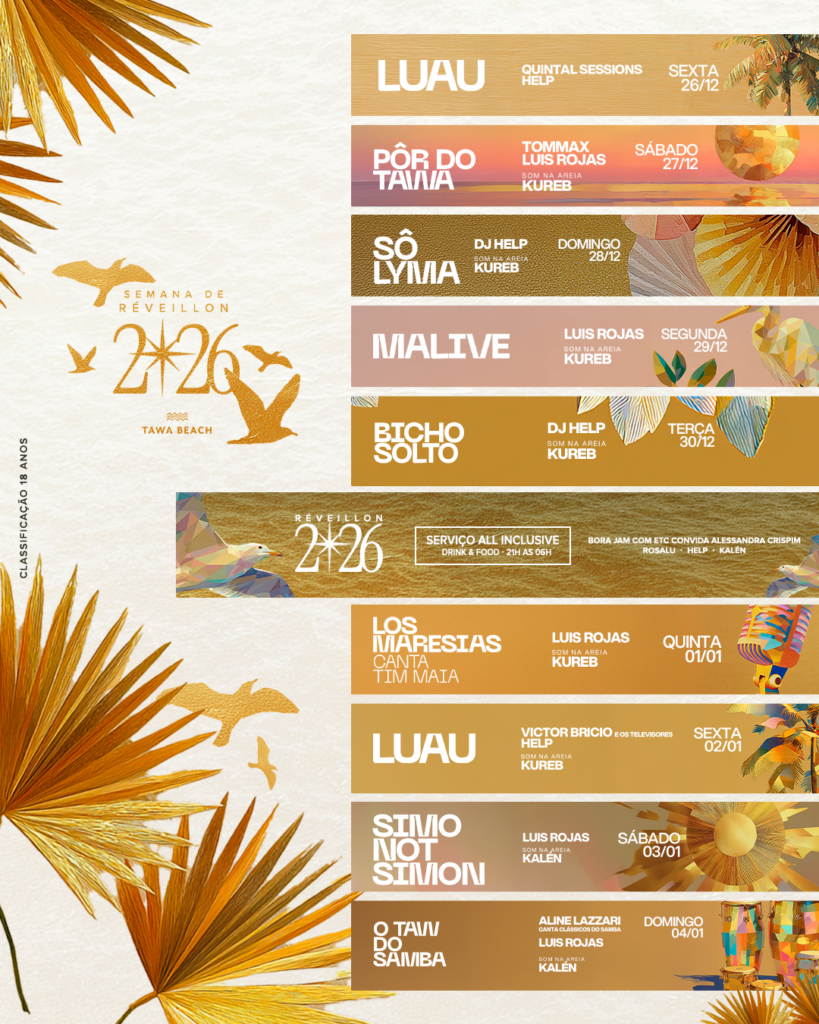 Serão dez dias consecutivos de eventos, sempre de frente para o mar, reunindo DJs, shows ao vivo, experiências gastronômicas e diferentes atmosferas musicais. Do samba ao eletrônico, passando por brasilidades e noites temáticas. A proposta é oferecer uma programação contínua de verão com festas diurnas, sunsets e uma virada de ano em formato premium. Além do calendário de eventos, o Tawa funciona regularmente durante o mês com abertura do club às 11h, de quarta a segunda-feira.